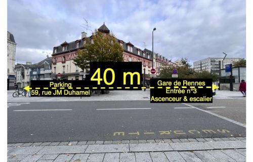 Les photos vous fournissent toutes les indications (place de parking, distance / sortie Nord de la Gare de Rennes, entrée de la rue Jean-Marie Duhamel et du parking).