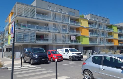 Parking souterrain sécurisé situé Porte de France à Saint-genis-Pouilly. L'immeuble se trouve proche du grand rond-point à l'entrée de la ville.
