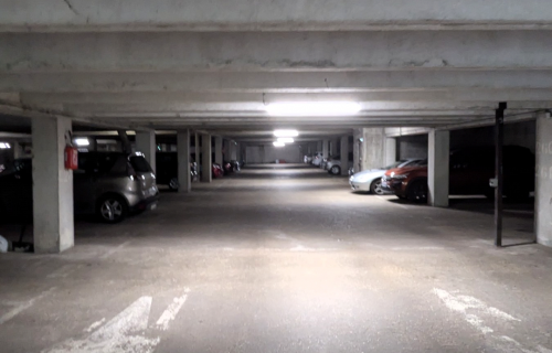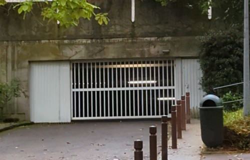 Place de parking située dans un parking collectif dans une résidence sécurisée à la rue JACQUES OFFENBACH à Saint-Germain-En-Laye. L'accès au parking est sécurisé par un portail électronique, et un accès piéton est également présent.